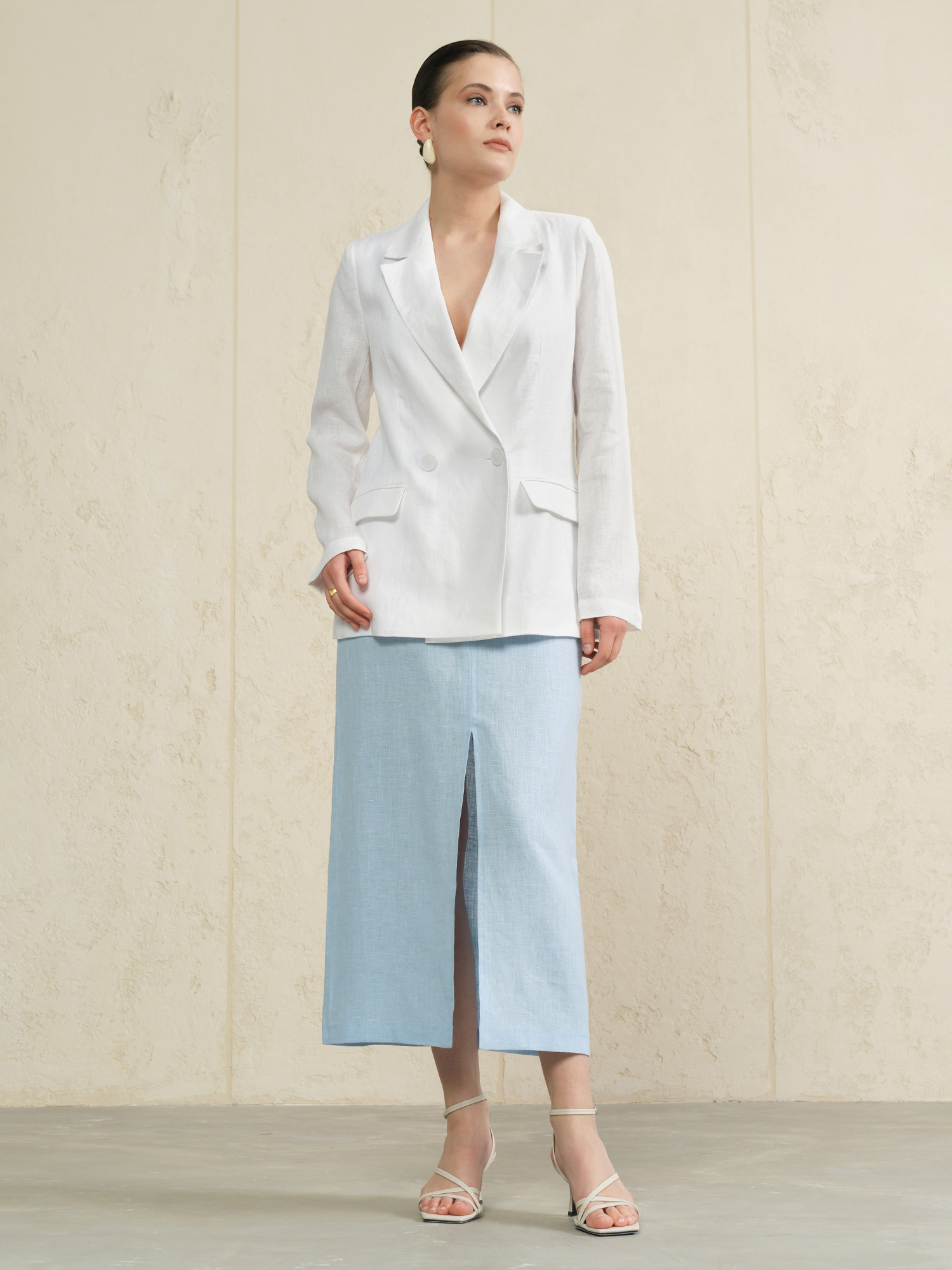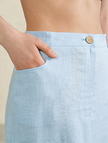 Льняная юбка просто супер! 100% натуральный лён дышит, летом в ней комфортно. Голубой цвет освежающий. Разрез спереди добавляет женственности.